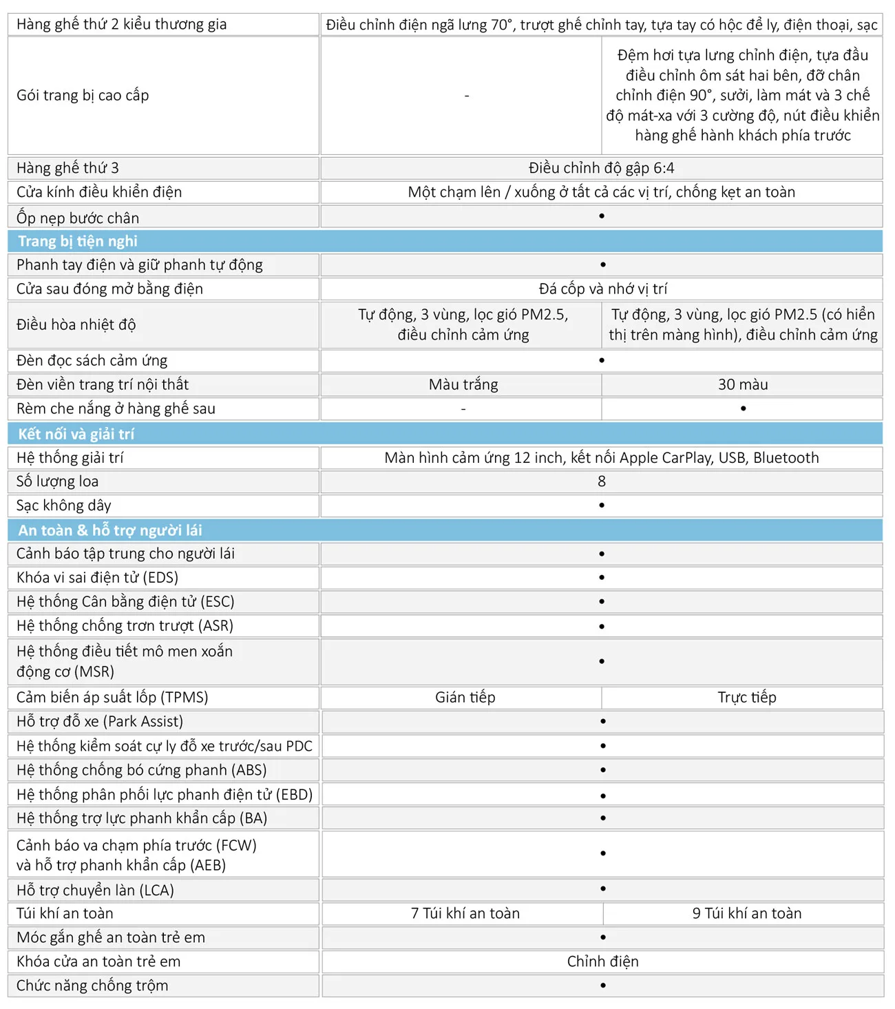 - Hai hàng ghế được bố trí riêng biệt, có bệ tì tay riêng, khay để ly riêng, cổng sạc USB, type C, hộc chứa đồ và có lối đi ở giữa.